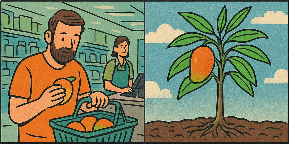 אני מודה שכצרכן (שאוכל מנגו) אני לא חושב על : משתלות, חברות דשן, תאגידי מים, יצרני טפטפות, יועצים אגרונומיים, חנויות ציוד, מערכות שינוע, חקיקה ממשלתית, מפעלי פלסטיק, חקלאי, עץ אחד, משווק וסופרמרקט. כי רוב התהליך המרשים הזה מתנהל למעשה הרחק ממבט עיני. אין לי מעורבות בתוכו וזה נוגע להמון דברים, חפצים ומוצרים שאני צורך ואינני מכיר את שרשרת התהליכים שנמצאים ברקע כי לימדו אותי להאמין רק למה שאני רואה.