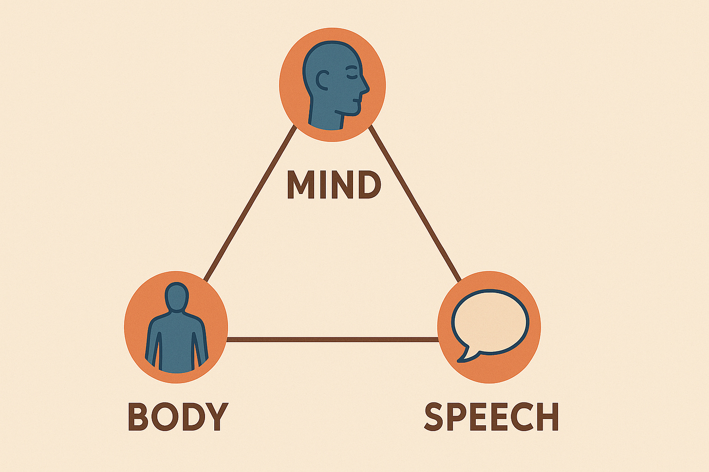 הגוף, הדיבור והתודעה אינם שלושה חלקים נפרדים הם שלושה ביטויים שונים של אותה ישות אחת. כאשר הם מתואמים, משהו בנו מסתנכרן: הפעולה תומכת בכוונה, הכוונה מתיישרת עם ההבנה, וההבנה נושמת חזרה לתוך הגוף.