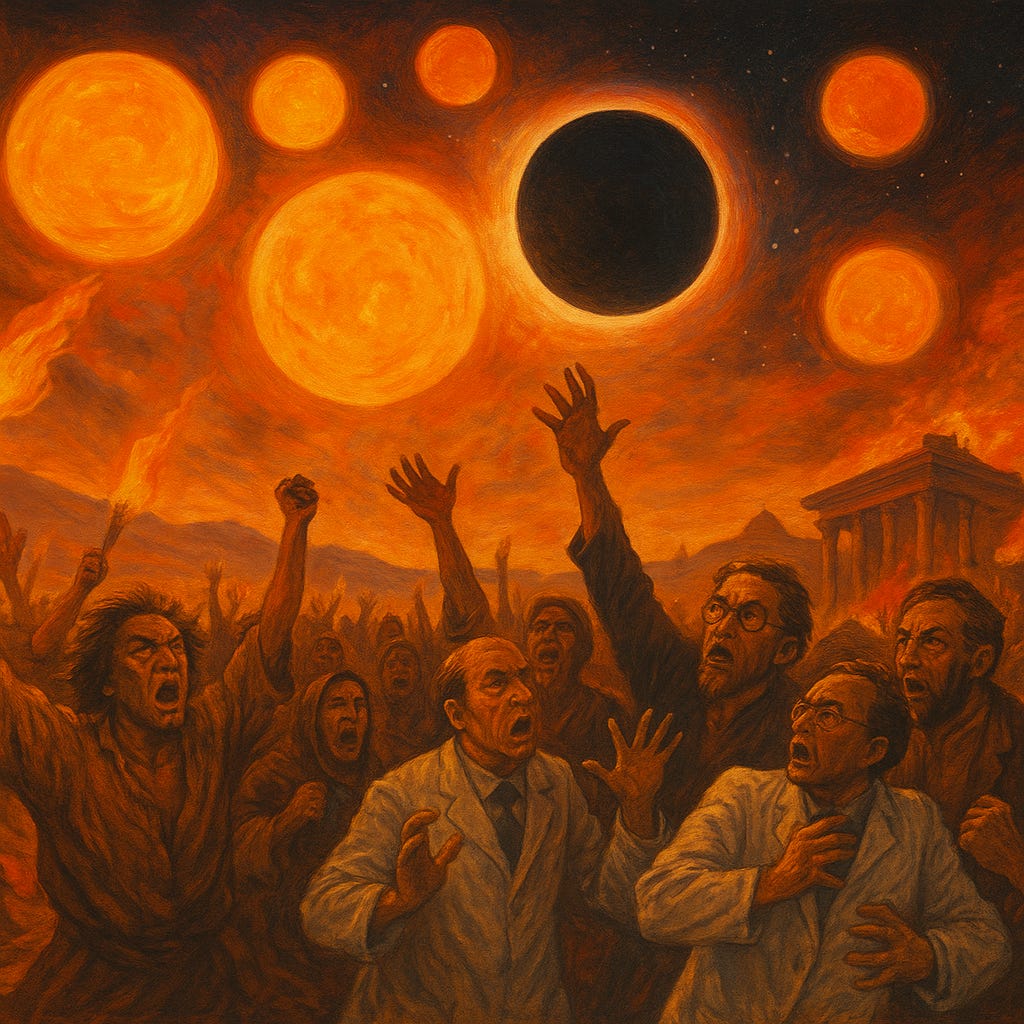 העלילה מתפתחת כאשר מדענים מזהים תופעות אסטרונומיות נדירות המבשרות על ליקוי שמיימי יוצא דופן - רגע שבו השמשות יסתירו זו את זו, ולראשונה זה אלפי שנים ישרור חושך מוחלט על הכוכב. הידיעה הזו עוררה פחדים עמוקים ושיגעון המוני בקרב תושבי הכוכב, החוששים שהשמש לא תשוב להאיר לעולם. הם החלו לתקוף מדענים, אנשי דת וממשל, הדליקו אש והבעירו את הכוכב בתקווה שיפזרו את החשיכה. אך החשיכה התגברה, וברגע הליקוי, בחושך המוחלט, גילו תושבי הכוכב כי השמיים זרועים כוכבים מאירים, והם אינם בודדים כפי שחשבו תמיד.
