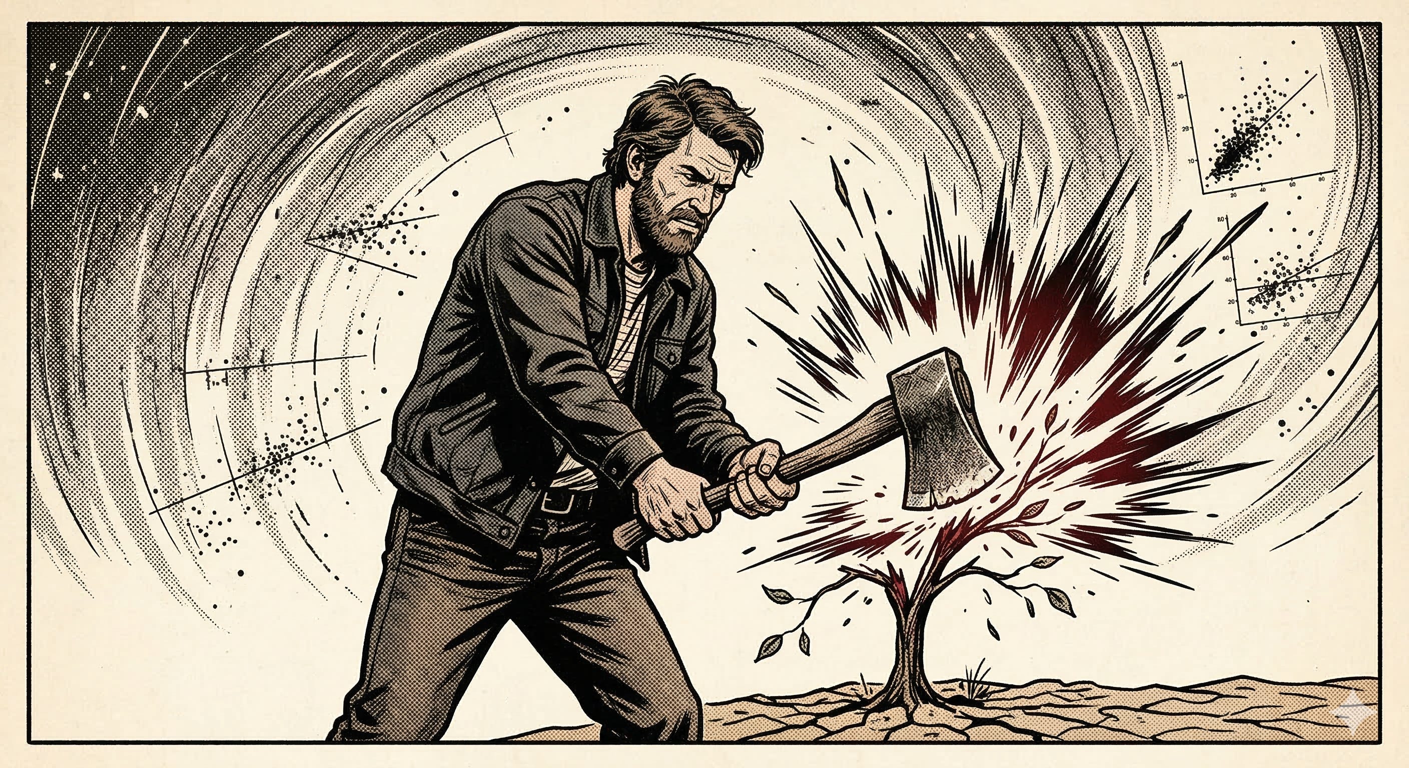 בכל פעם שהנחת היסוד שגויה (והיא שגויה לעיתים קרובות במערכת סטוכסטית), המסקנה תהיה שגויה. הטרגדיה היא שאנחנו הופכים לעבדים של ההיגיון הזה. אנחנו לא מתווכחים עם המציאות, אנחנו מתווכחים עם ״הנחת היסוד״ שלנו שנשברה. במקום להשתמש באלמנט מתכת כדי לגזום את הציפיות (כפי שגנן משתמש במזמרה כדי לחזק את העץ), אנחנו משתמשים בה כגרזן, וכורתים את כל העץ. או במילים אחרות: ברגע שהמציאות לא מתיישרת עם הלוגיקה, הגרזן של השליטה לא גוזם את הפעולה (העץ) אלא כורת אותה לגמרי. זהו רגע הפיצוץ ואיבוד השליטה המוחלט.